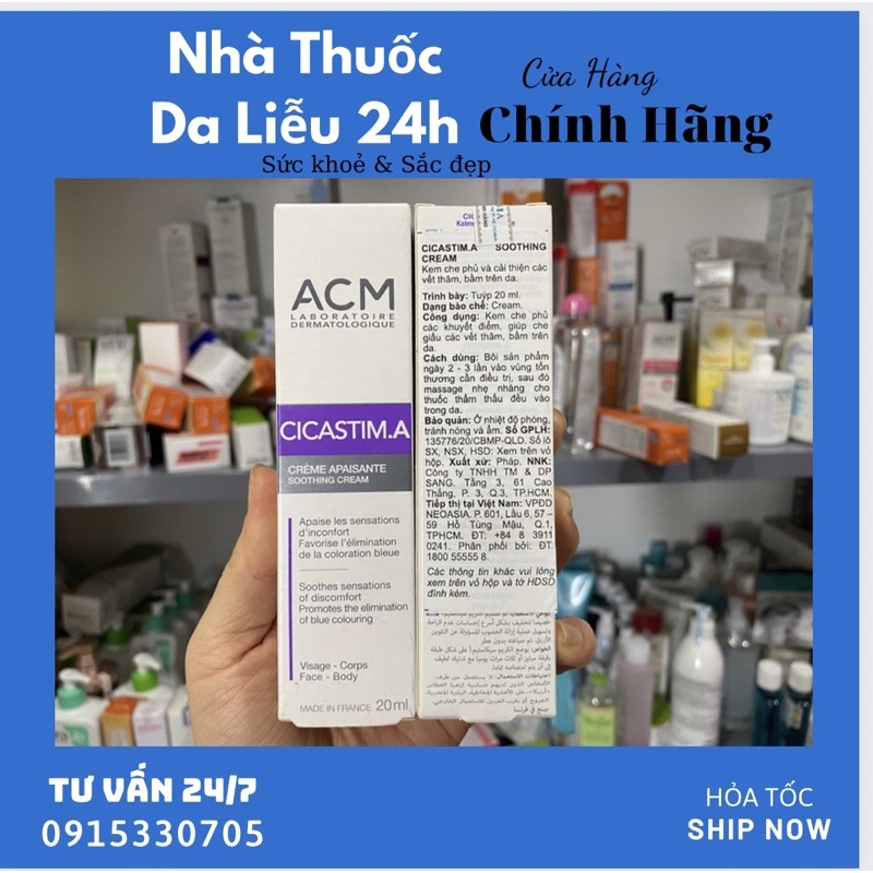 ACM CICASTIM REPAIR 20ml.Thành Phần:Aqua( water) Cetyl alcohol, paraffinum liquidum...Công dụng:Kem CICASTIM Với công thức chuyên biệt cho da bị tổn thương , da kích ứng giúp nhanh chóng phục hồida bị hư tổn, làm dịu vùng da bị tổn thương , thúc đẩy tái tạo lại lớp biểu bì , nhanh liền sẹo.Chỉ định: Trường hơp da bị trầy xước.Da bị tổn thương sau điều trị laser va bỏng nhẹDa bị tổn thương do côn trùng đốt.Cách dùng:Lấy một lượng vừa đủ thoa một lớp mỏng lên vùng da bị trầy xước , bị tổn thương, do côn trùng đốt sau khiđã làm sạch và lau khô da. Ngày dùng từ 1-2 lần cho đến khi khỏi hoàn toàn .Chú ý:Không dùng cho người bị dị ứng với các thành phần của mỹ phẩm, tránh tiếp xúc lên vùng mắt,để xa tầm tay trẻ em.
