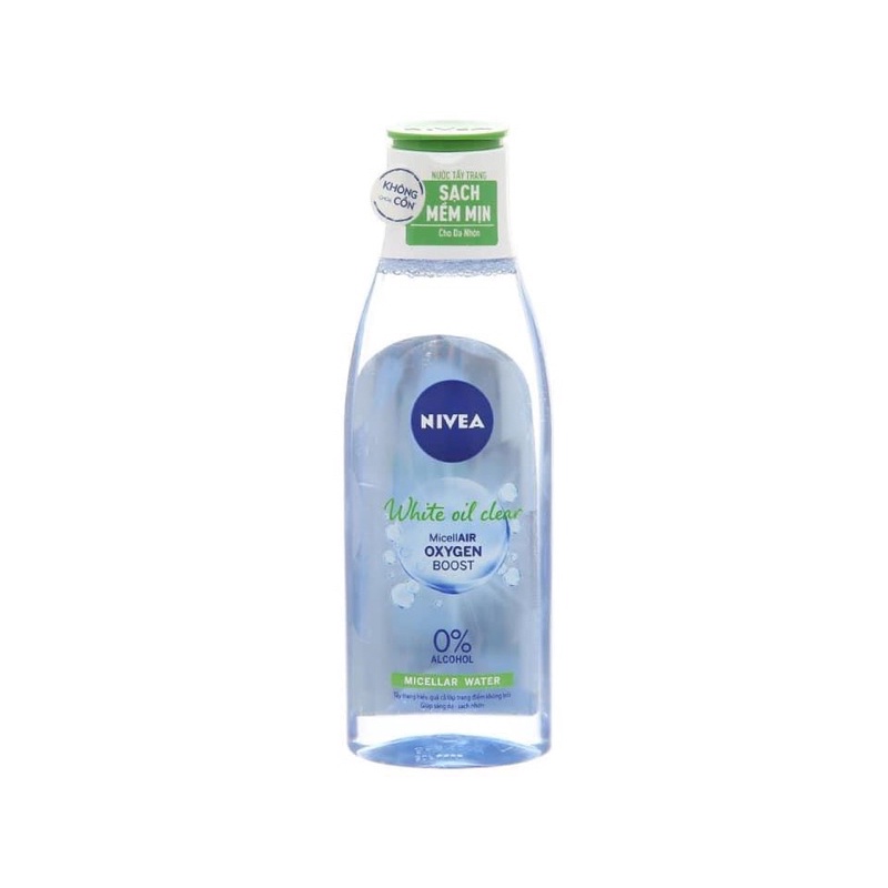 Tẩy trang Nivea-Nước tẩy trang không cồn, làm sạch da, kháng mụn, cung cấp độ ẩm, cân bằng độ ph cho da.💚💚💚Nước tẩy trang Nivea không 200ml💲💲120Nước tẩy trang NIVEA chai lớn 200ml mẫu mới .Có 3 màu nhé khách:✅:Màu Hồng:- Cho da thường , khô✅ Màu xanh:- Cho da Nhờn✅ Màu Tím: - Cho da mụn❇️❇️ Dịu nhẹ cho da và tăng cường khả năng hấp thu Hỗ trợ sản sinh Collagen cho da sáng, mịn màngChứa tinh dầu hạt trái nho kháng ngăn ngừa mụnNước Tẩy Trang Nivea Acne Care Make Up Clear Micellar Water (200ml) được dùng công nghệ Mi-xen tăng cường oxy (Micellar Oxygen Boost) giúp hòa tan và làm sạch sâu các lớp trang điểm, ngay cả ở mắt, môi mà vẫn dịu nhẹ cho da.Tăng cường khả năng hấp thu oxy, từ đó hỗ trợ quá trình sản sinh Collagen cho da sáng, mịn màng.Chứa tinh dầu hạt trái nho với hàm lượng cao, được biết như chất chống oxy hóa và có tính không chỉ giúp se khít lỗ chân lông mà còn ngăn ngừa mụn hiệu quả.